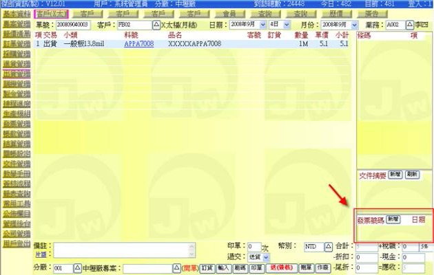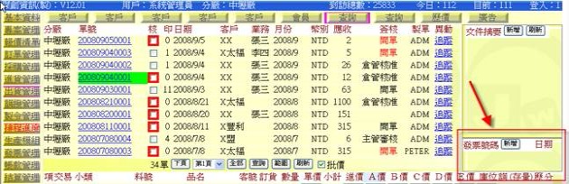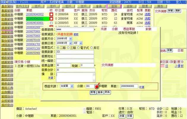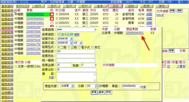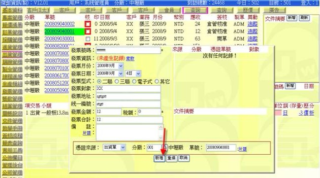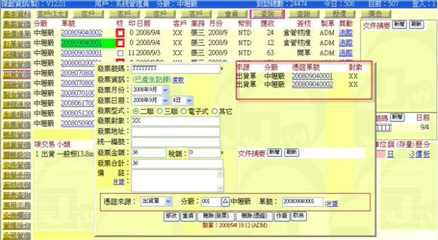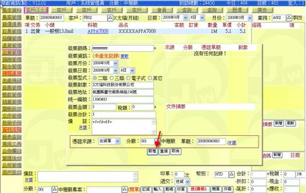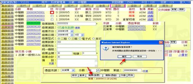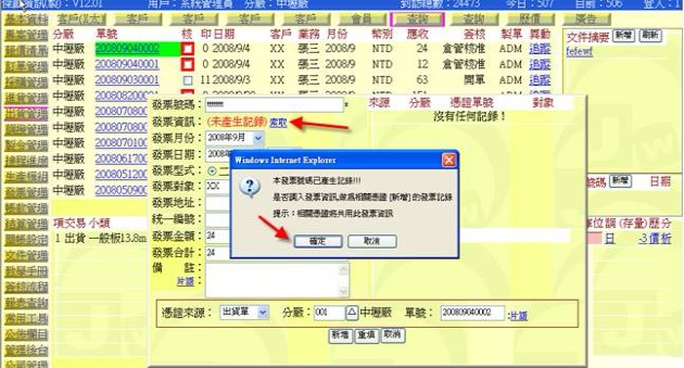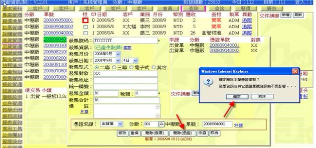 - 例如 2008009040001 跟 200809040002 是要開出同一張發票號碼,且若在 2008009040001 已先作出一筆發票記錄,當在 200809040002 新增填上發票號碼時(跟 2008009040001 同一個發票號碼 ttttttttt),這時可按下「索取」,系統會查找並在「發票資訊」欄位處顯示 "已產生記錄" 字樣,並詢問是否調入相同的發票欄位,若回應「確定」,就可以把 ttttttttt 的發票資料寫入(提示:發票分攤金額部分要自行輸入計算)。