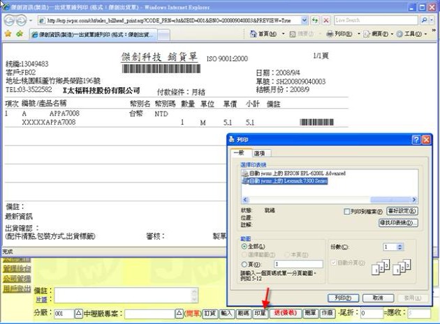 - 按下方「印單」按鈕(下圖紅色箭頭處),可套表列印此張進貨單。