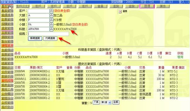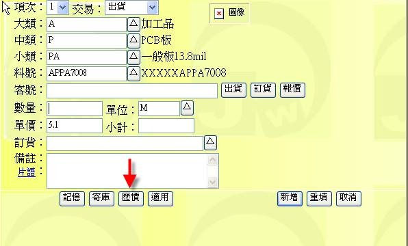 - 按下「歷價」按鈕(下圖紅色箭頭處),可展開「出貨單→歷價查詢表」,從中可拷貝出歷史單價或料號基本表單中的五種售價中的一種(A、B、C、D、E價)。