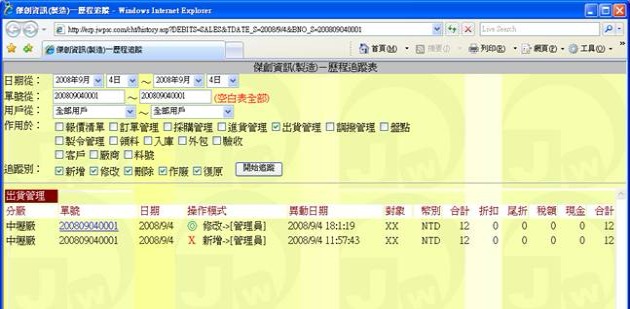 異動追踪是做為一個「操作過程全記錄」的查訽工具,它可告訴你某張單據或某個對象或某個料號在什麼時侯被某個人做了什麼動作,其中包含新增、修改、刪除等任何與之有關的動作,皆會被完完整整的記錄下來,你可在此探查得知過程中發生了什麼事,這對於管理者是一個極為重要的輔助工具。