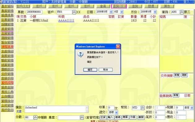 (下圖示範若有異動單頭欄位,它會提示檢查並詢問是否存入)