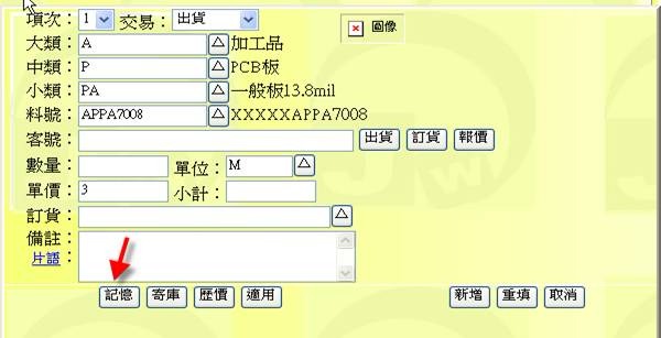 - 按下「記憶」按鈕(下圖紅色箭頭處),可從料表中有勾選出的記憶表中挑選出相關的品項欄位。