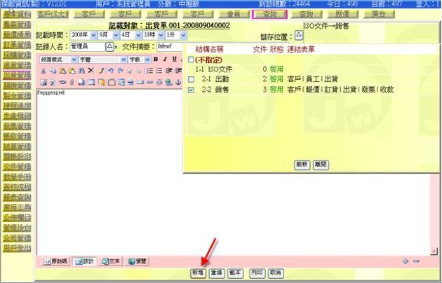- 按下右側上方文件區的「新增」按鈕(下圖紅色箭頭處),可以輸入與該單有關的相關文件,例如發票影本掃描件、交易過程中的 Email 摘要、必須提供給客戶的檢驗報告等。