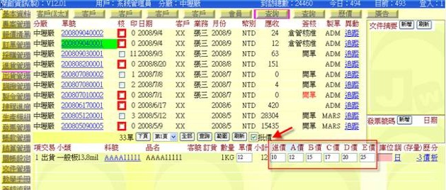 - 勾選「批價」選項(下圖紅色箭頭處),可以比對並修改出貨單價和料號基本價(A、B、C、D、E)。