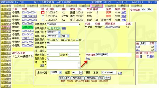 - 如欲刪除此張單據與發票的對應資訊,先點選進入發票資料,以 2008009040001 為例。