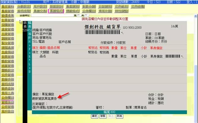 進入方式:主功能「 管理後台」→次功能「單據格式」→作用單據為「出貨管理單據」的格式→「版面」