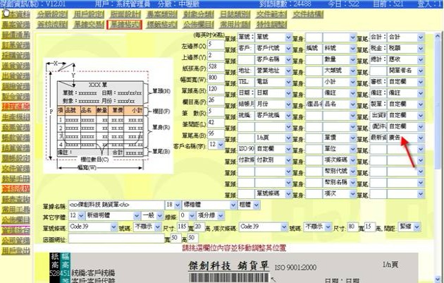 - 此功能可讓用戶自行設定出貨單套印的「版面」格式,它可讓你在任意尺寸與任意欄位位置的出貨單據上,套印出所有與出貨有關的欄位內容。