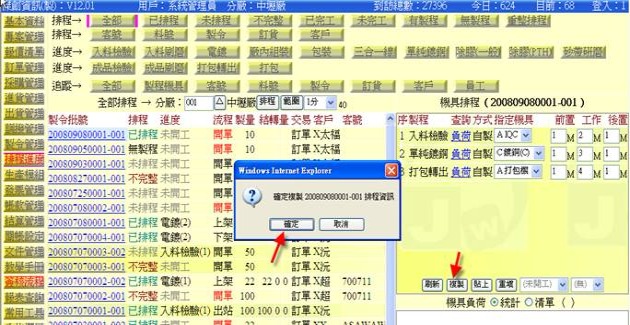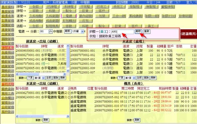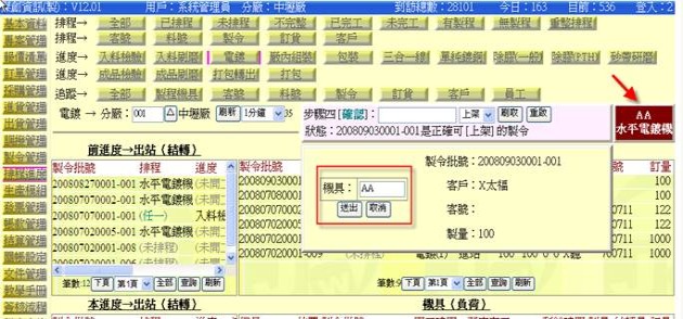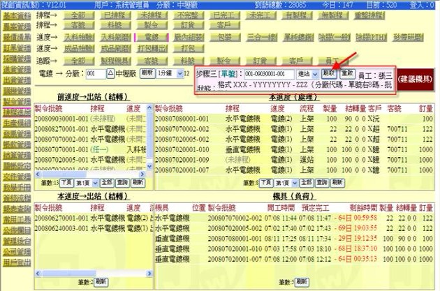 請注意:畫面右方有一個紅色框,內裏呈現的就是這張 200809030001-001工單在排程裏所預設的機台,現在它醒目的出現提示,工作人員必須依照其指示刷取 "AA" 這個機台代碼,否則不會讓它通過(允許或不允許的設定,可在參數調整中進行規則設定)。