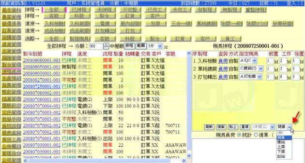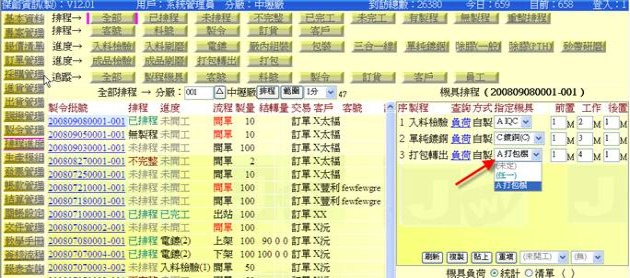 - 「排程」時:只需在看板中,以下拉選項方式,指定某製令中的某製程要使用那部機台進行生產排程。