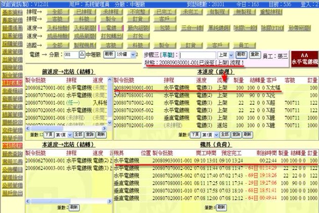 首先我們 200809030001-001 這張製令批單呈現在「本進度(處理)」區裏,而且「流程」欄位顯示的是 "進站",現在我們要將它上架到機台中,並觀察動態看板的反應結果為何。
