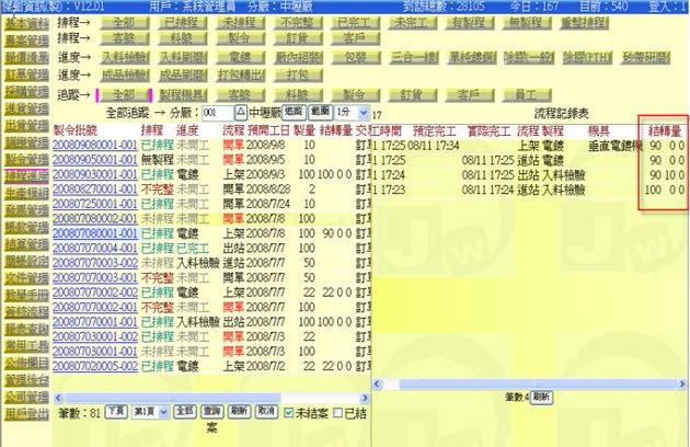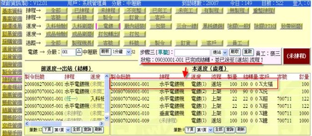 - 看板結果:處理完後,200809030001-001 這張製令批號將從「本進度(處理)」區消失,然後出現在「本進度→出站」區。
