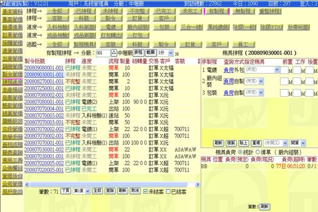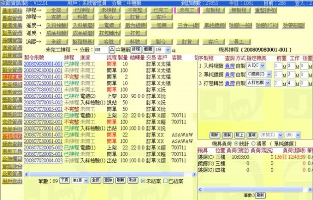 - 「排程」:在製造業或加工業中,每一個製程站點(又叫車間)內往往有數部機台(機具)可以生產,例如有 N 部車床機或 N部沖壓機,而在業務接單過程中往往又會同時有多張訂單需要型成製令單投入生產,如何有效率的安排,讓機台可以發揮出較高產值,這個安排就叫做是排程。