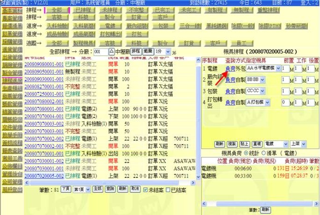 - 2. 雲端 ERP 在製程項下可設定有機台代碼,而每一張製令單中皆會有一張描繪該單製品在生產過程中所應遵循的製程與順序,所以當需要針對某一製令進行排程時,可依其關連性展開 ,得到某製程下的機台清單,並根據現有機台的負荷值進行判斷,進而指定該工單製程要排定在那一部機台中進行生產(一般是以負荷值較低者為佳),或者可以不指定使其為「任一」,交由現場工作人員自行決定。
