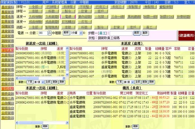 - 「進度」:在每一個製程站點上的每部機台上,都會有操作人員正在值機工作,到底那些站點正有那些工單在排隊等著生產,數量有多少、機台上 正在生產那些製令單,上架了多少量, 己經下架正在等待搬運出去的是那些工單,數量又有多少、那些員工正在值班,正在那部機器上作業;以上這些要能反應出「車間現況」的資訊,就叫做是進度。