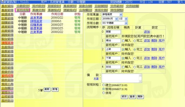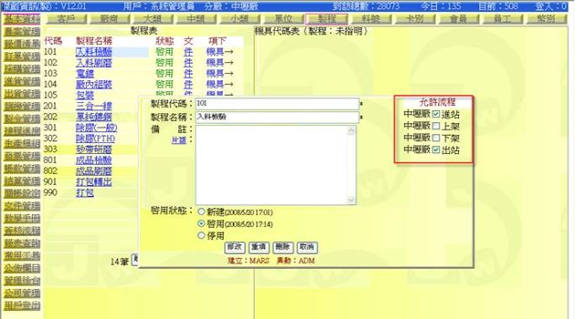 - 各製程表單中可以設定為允許那些流程要使用或不使用。