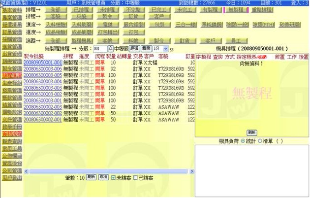 - 「無製程」:製令單中未設定製程的列表(可做為批次大量開單後的檢查)。