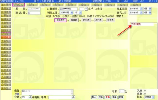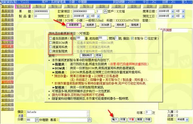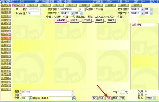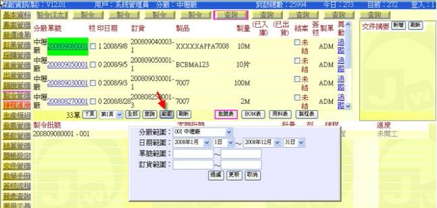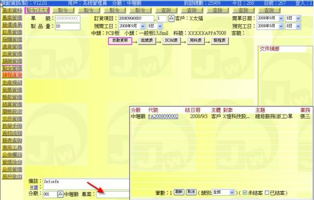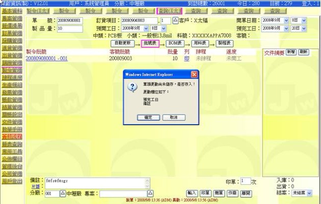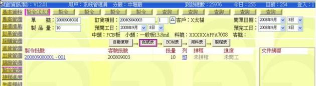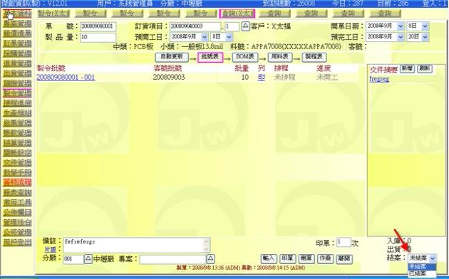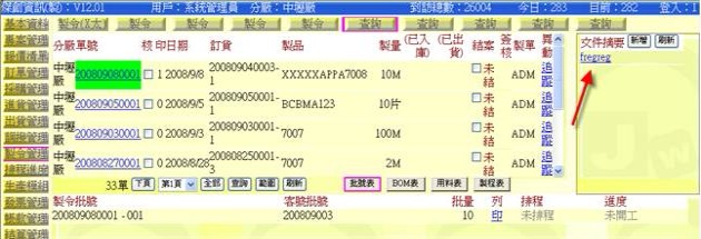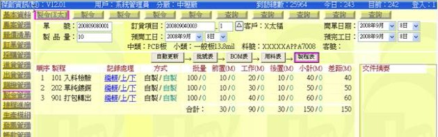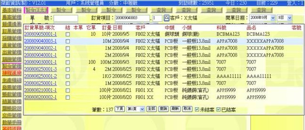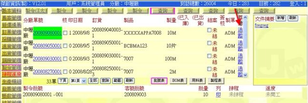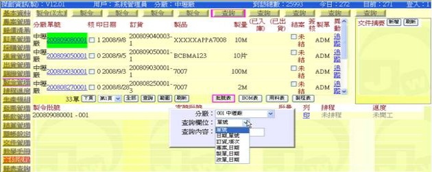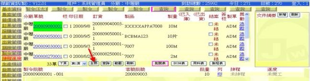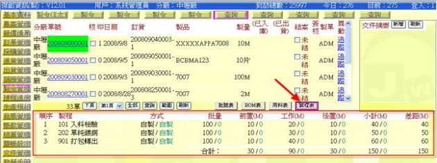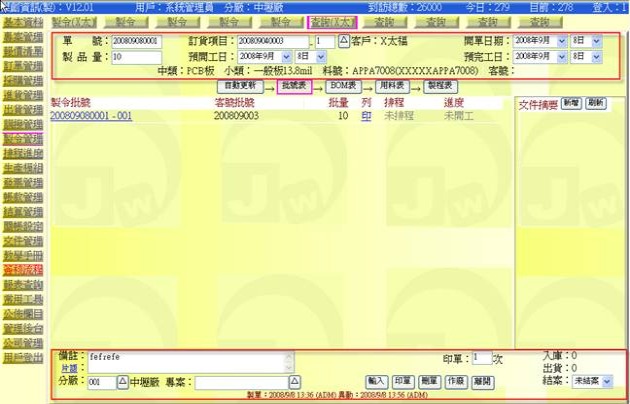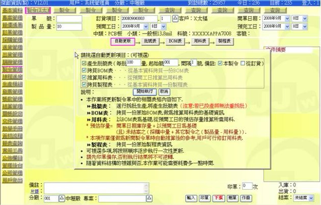 (下圖示範被叫出的製令單據,注意上方次功能的「查詢(X太)字樣」,它代表正在修改的單子屬於X太福這個客戶的製令)