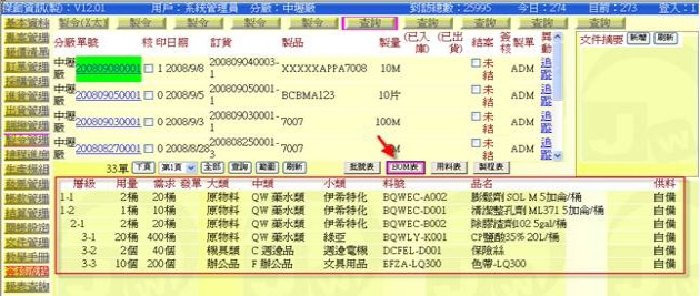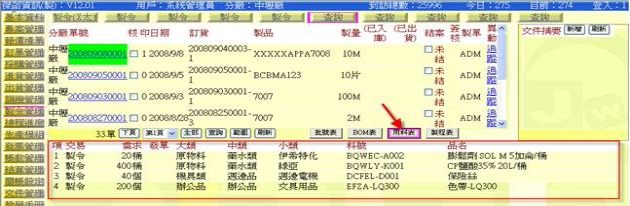 - 按下「用料表」按鈕(下圖紅色箭頭處),即可在跟單副表區顯示該張製令預開工日所需備不足的「用料表」。