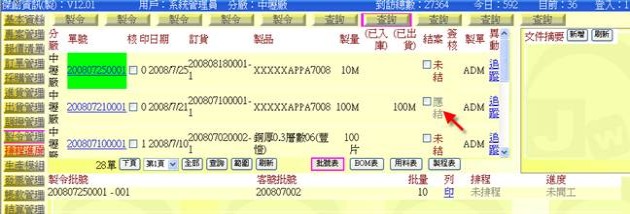 - 如果某製令的「(已入庫)量」或是「(已出貨)量」已達該單「製品量」時,則在「結案」欄位會閃爍著「應結/未結」交替文字,表示此筆 製令應該要進行結案。