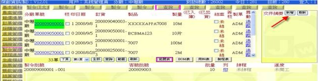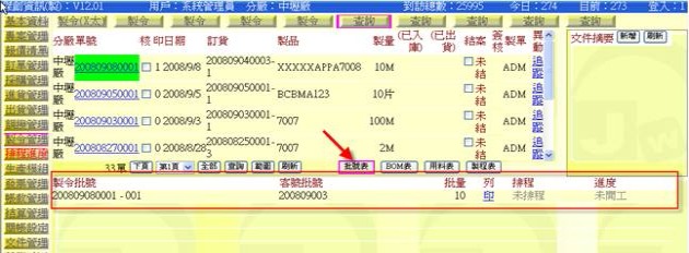 - 按下「批號表」按鈕(下圖紅色箭頭處),即可在跟單副表區顯示與該張製令有關的製令「批號表」。