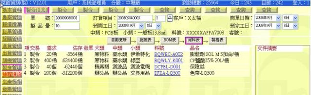 - 表格3:用料表,以預開工日推算出當日生產此製令時所需準備的用料表。