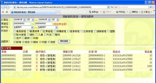 異動追踪是做為一個「操作過程全記錄」的查訽工具,它可告訴你某張單據或某個對象或某個料號在什麼時侯被某個人做了什麼動作,其中包含新增、修改、刪除等任何與之有關的動作,皆會被完完整整的記錄下來,你可在此探查得知過程中發生了什麼事,這對於管理者是一個極為重要的輔助工具。