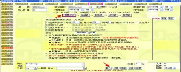 - 按下「BOM表」按鈕(下圖紅色箭頭處),即可在跟單副表區顯示與該張製令有關的製令「BOM表」。