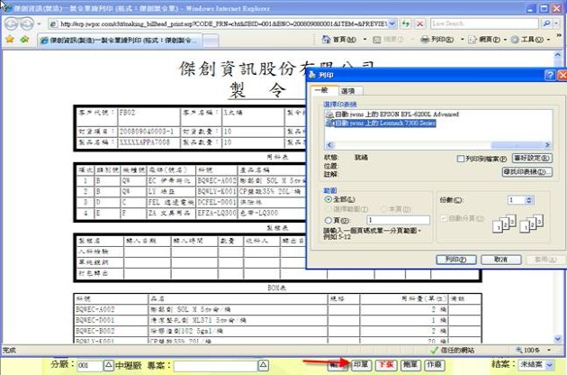 - 按下方「印單」按鈕(下圖紅色箭頭處),可套表列印此張製令單。
