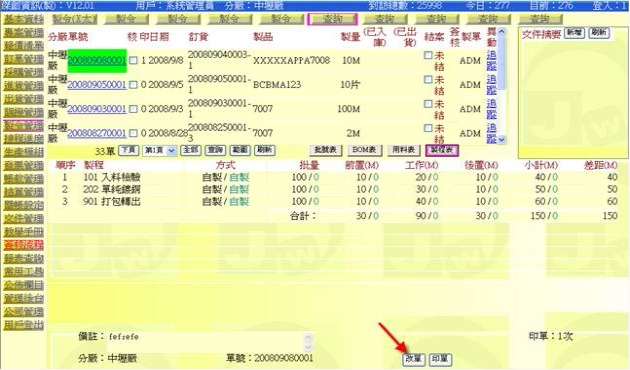 - 點選某單號後,下方區域會呈現該製令的相關副表,按下該表下方的「改單」按鈕(下圖紅色箭頭處),即可叫出此單進行修改。
