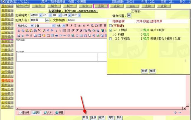 - 按下右側上方文件區的「新增」按鈕(下圖紅色箭頭處),可以輸入與該單有關的相關文件,例如注意事項、工程圖等。