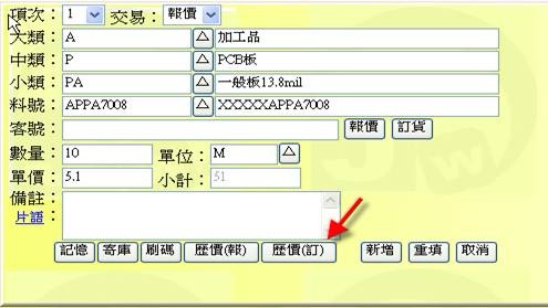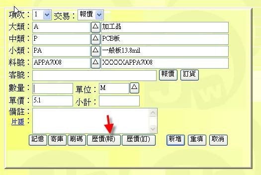 - 按下「歷價(報)」按鈕(下圖紅色箭頭處),可展開「報價單→歷價查詢表」,從中可拷貝出歷史單價或料號基本表單中的五種售價中的一種(A、B、C、D、E價)。