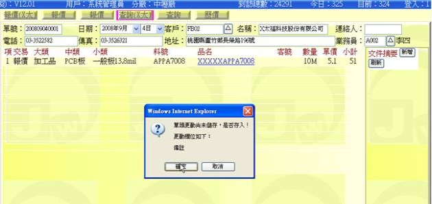 (下圖示範若有異動單頭欄位,它會提示檢查並詢問是否存入)
