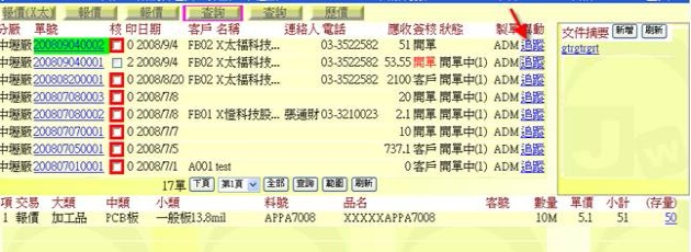 點選上方次功能中任意一個「查詢」後,即可開啟報價帳簿,帳簿中存有每一張單據與品項明細,畫面各區域介紹如下: