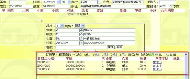 (下圖示範「報價單→歷價查詢表」中的單一客戶歷價資訊,點選表中的某「單價」即可拷貝出價格)