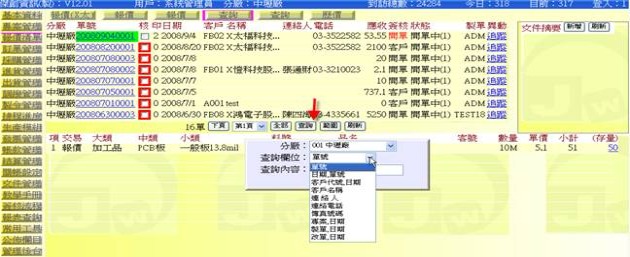- 按下「查詢」按鈕(下圖紅色箭頭處),即可出現「查詢欄位」與「查詢內容」窗格,可在此指定欄位並輸入內容進行查找,找到時會將單號以閃動字體 方式呈現。