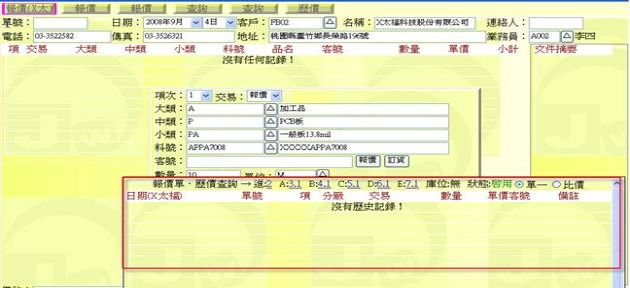 - 清除「客號」欄位,再按下該欄右側「報價」按鈕,即可展開「報價單→歷史查詢表」,可從清單中挑選出相關的品項欄位 ,若該筆客號也會拷貝出此欄位。
