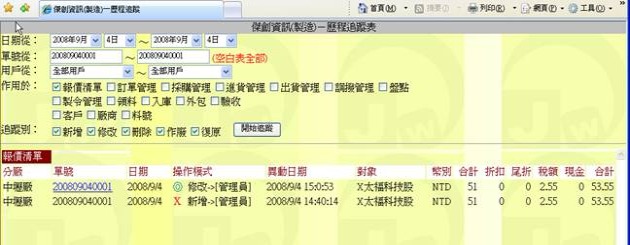 異動追踪是做為一個「操作過程全記錄」的查訽工具,它可告訴你某張單據或某個對象或某個料號在什麼時侯被某個人做了什麼動作,其中包含新增、修改、刪除等任何與之有關的動作,皆會被完完整整的記錄下來,你可在此探查得知過程中發生了什麼事,這對於管理者是一個極為重要的輔助工具。