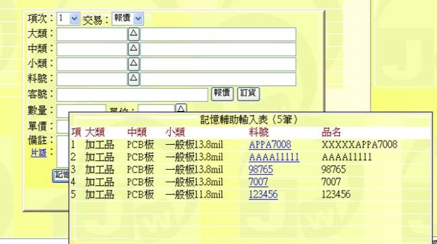 (下圖示範「記憶表」清單,點選表中的某「料號」即可拷貝出相關的品項欄位)