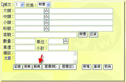 - 按下「刷碼」按鈕(下圖紅色箭頭處),即可採用條碼方式進行刷取品項。