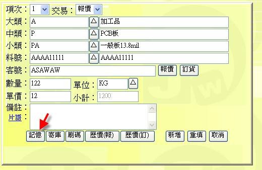 - 按下「記憶」按鈕(下圖紅色箭頭處),可從料表中有勾選出的記憶表中挑選出相關的品項欄位。