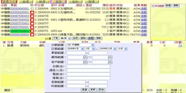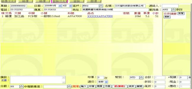 - 「傳真」:自動依據「客戶」代碼欄位拷貝出傳真,或者手工輸入。