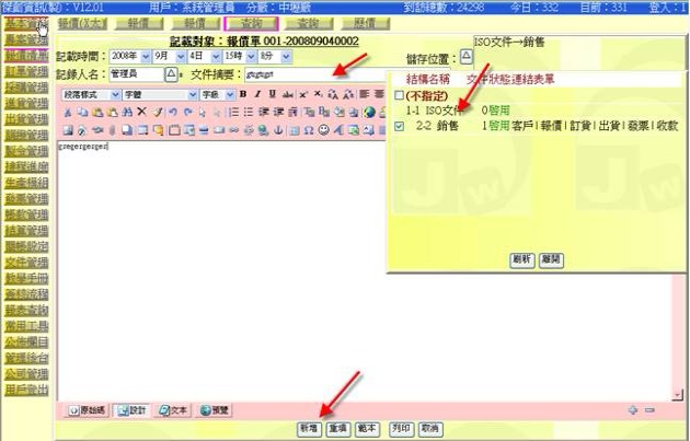 - 按下右側上方文件區的「新增」按鈕(下圖紅色箭頭處),可以輸入與本單有關的相關文件,例如報價過程中的 Email 摘要、商品檢驗報告等。