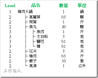 參考最上面的圖表說明,BOM表通常會作成階層結構,有上下階的從屬關係,也就是說會有母件(Parent parts)與子件(Child parts),上圖的「魚丸」就是母件,其下面的魚肉、太白粉、糖、鹽巴…等就是子件。以之與全部展開成一階的BOM表比較起來,這種階層式結構表的好處是可以讓生產線清楚的知道「魚丸」需要用到什麼材料來做成,而不至於把魚肉及太白粉一起放進火鍋中煮,真要是這樣的話就糗了。