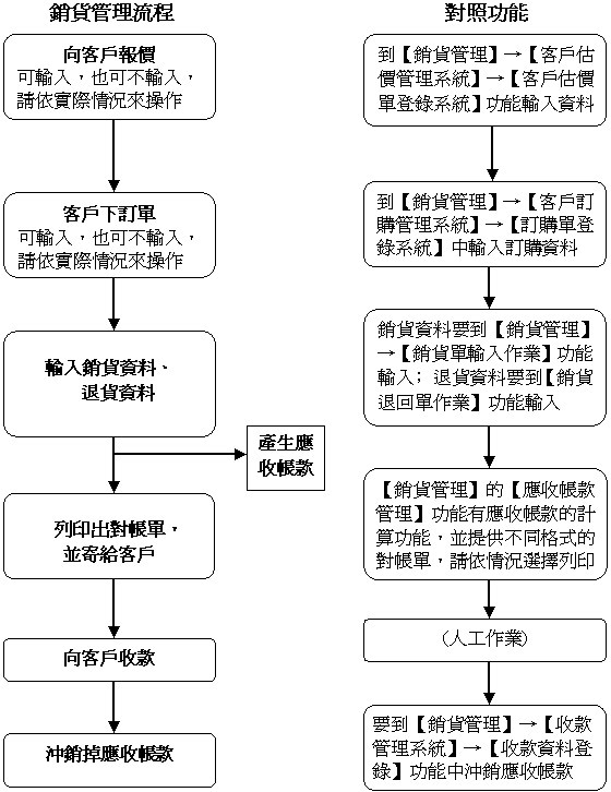 除了這二項差別外,銷貨與進貨不論是在作業流程、功能上都很相似,因此本章 節就把銷貨管理與進貨管理的內容編輯在一起。