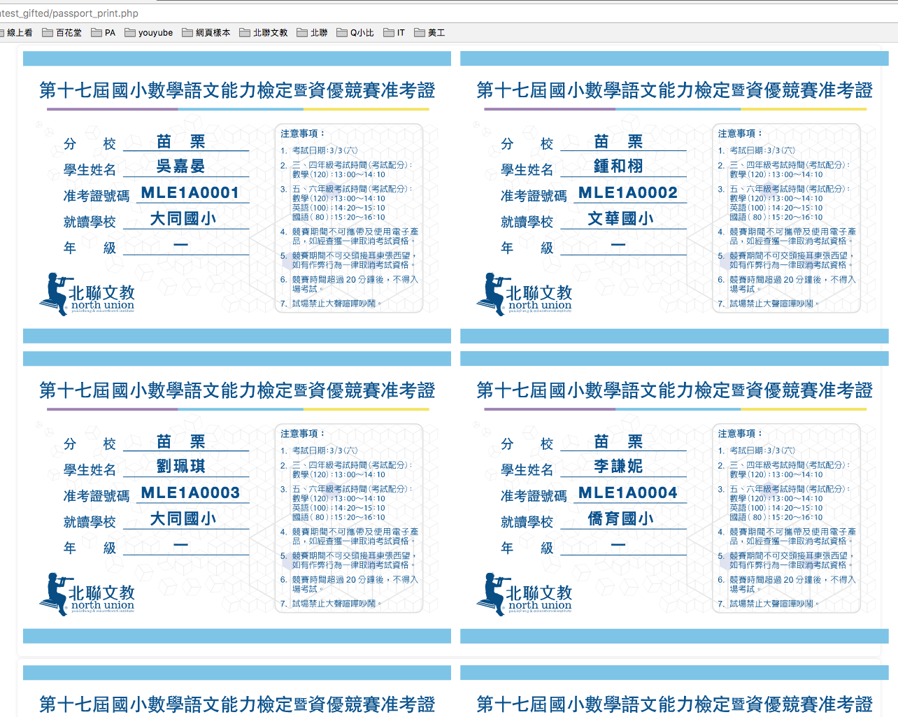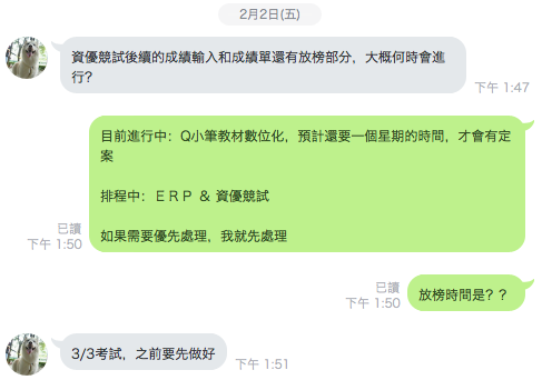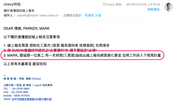 標題: 關於資優競試線上報名日期: 2017年12月12日 GMT+8 上午10:16:25DEAR 偉銘, PARKER, MARK以下關於資優競試線上報名注意事項1. 線上報名頁面 控制在三頁內 (首頁 報名資料表 放榜查詢) 勿再增多2. 除 SUSAN會議時所提供之"必要資料"外 請不要設定"必填"3. MARK, 請協調一位美工 用一天時間(三頁面)協助此線上報名網頁美化事宜 並將工作排入下周周計畫以上若有未盡事宜 歡迎告知--總 管 理 處 - 特助 謝錡 (Chevy)北聯文教 / 部落_森 學院 / cupoti 沏禾舞茶