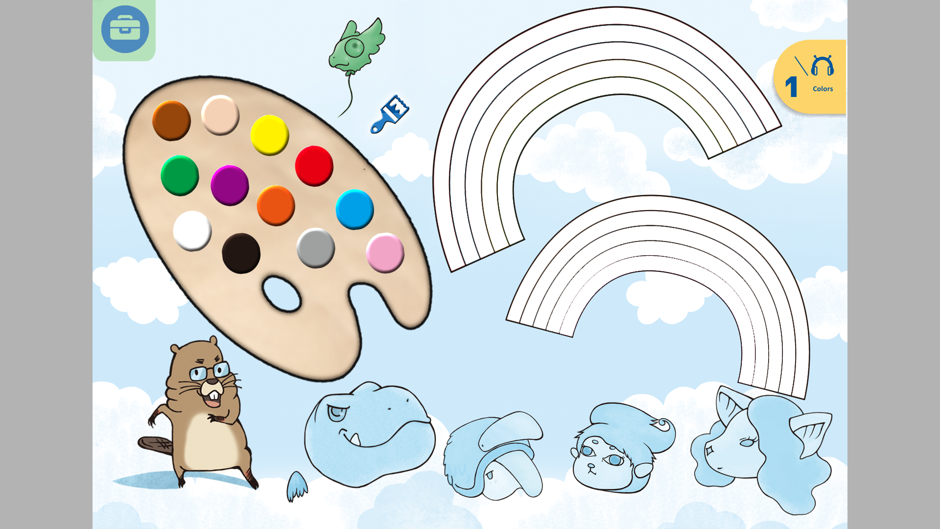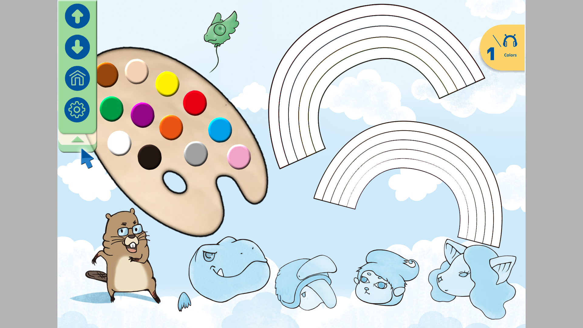 教學設計內容 畫面會有一個調色盤,可以點選顏色附在刷子的游標上。 確定好所選的顏色,刷子可以移動到彩虹的位置,隨意點放在空白處,直接填滿。