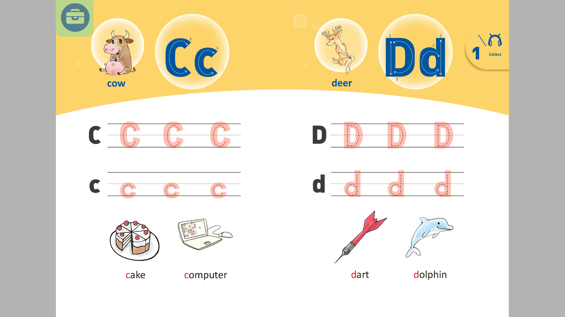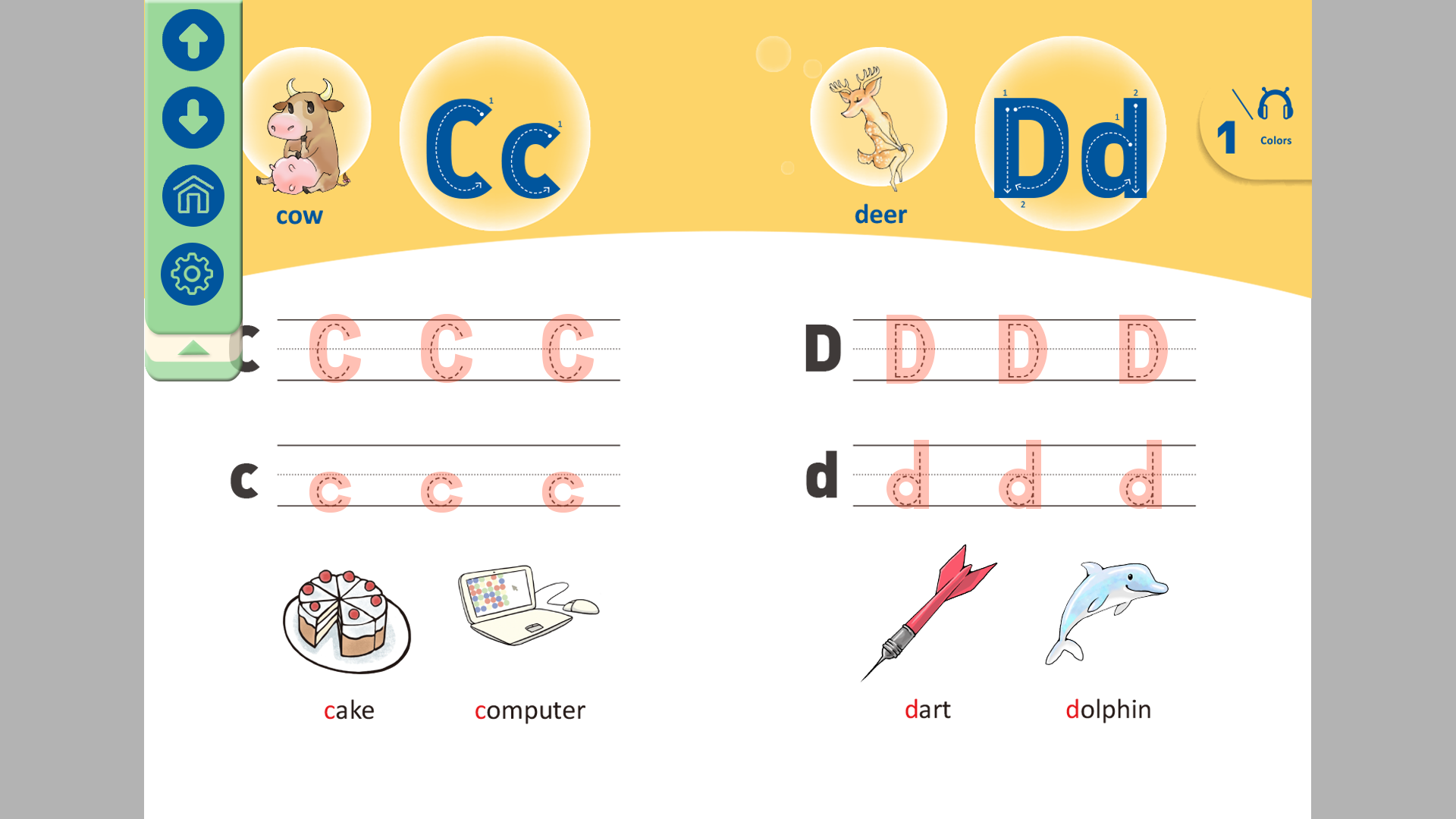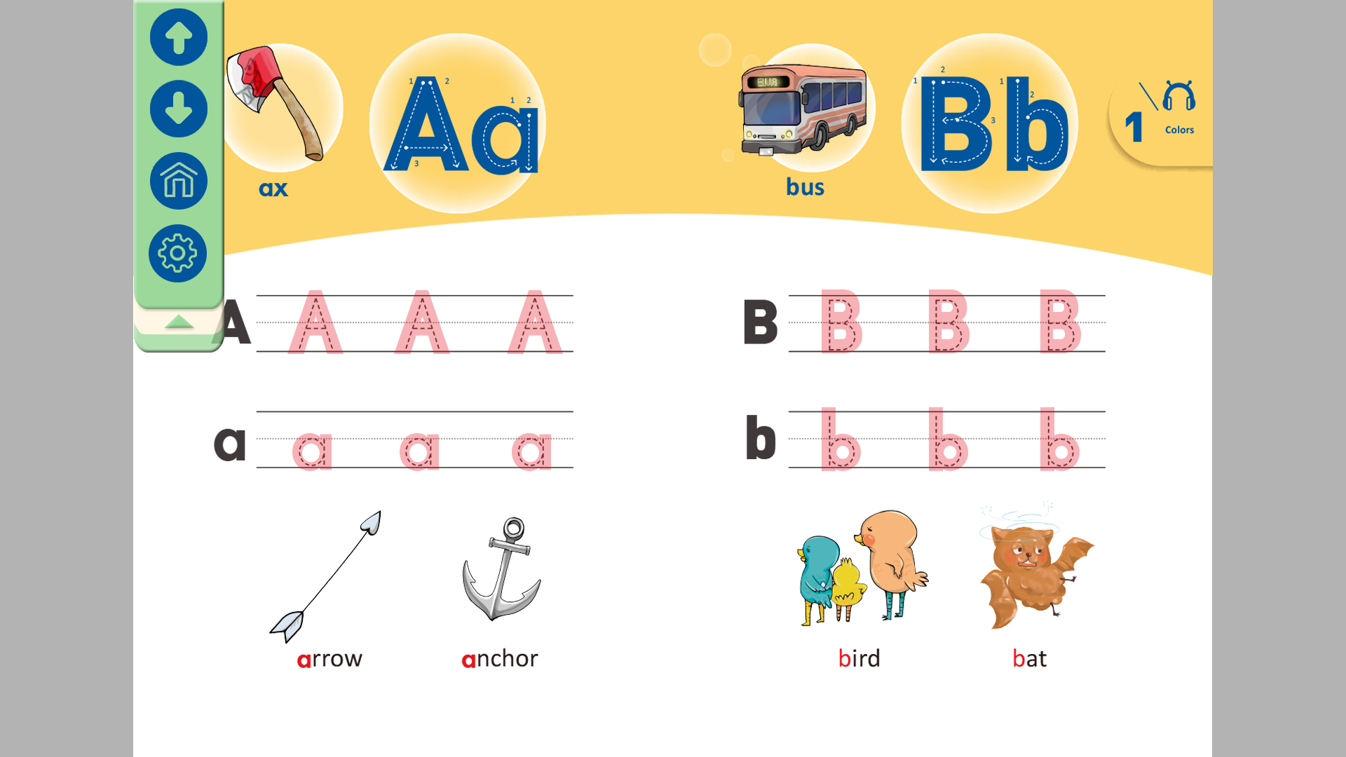教學設計內容 點擊最上方的大小寫字母(虛線),會出現在畫面中間放大的效果,並示範大小寫的筆順。寫完之後,字母縮回原處,並保留虛線的筆順。 點擊單字會有發音。